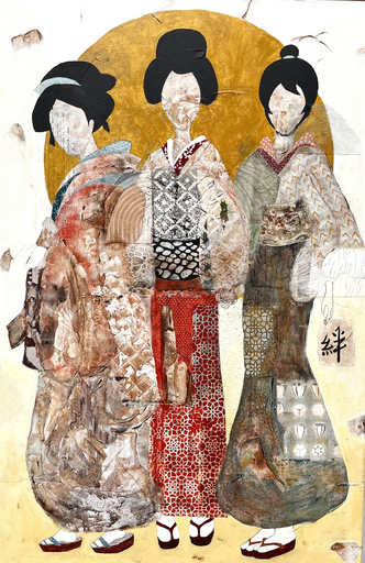 Ik begin met een volledig abstract werk, waarin in kleuren, textuur en collages in balans probeer te brengen. Als dat naar tevredenheid is, ga ik in het abstracte werk figuren zoeken.